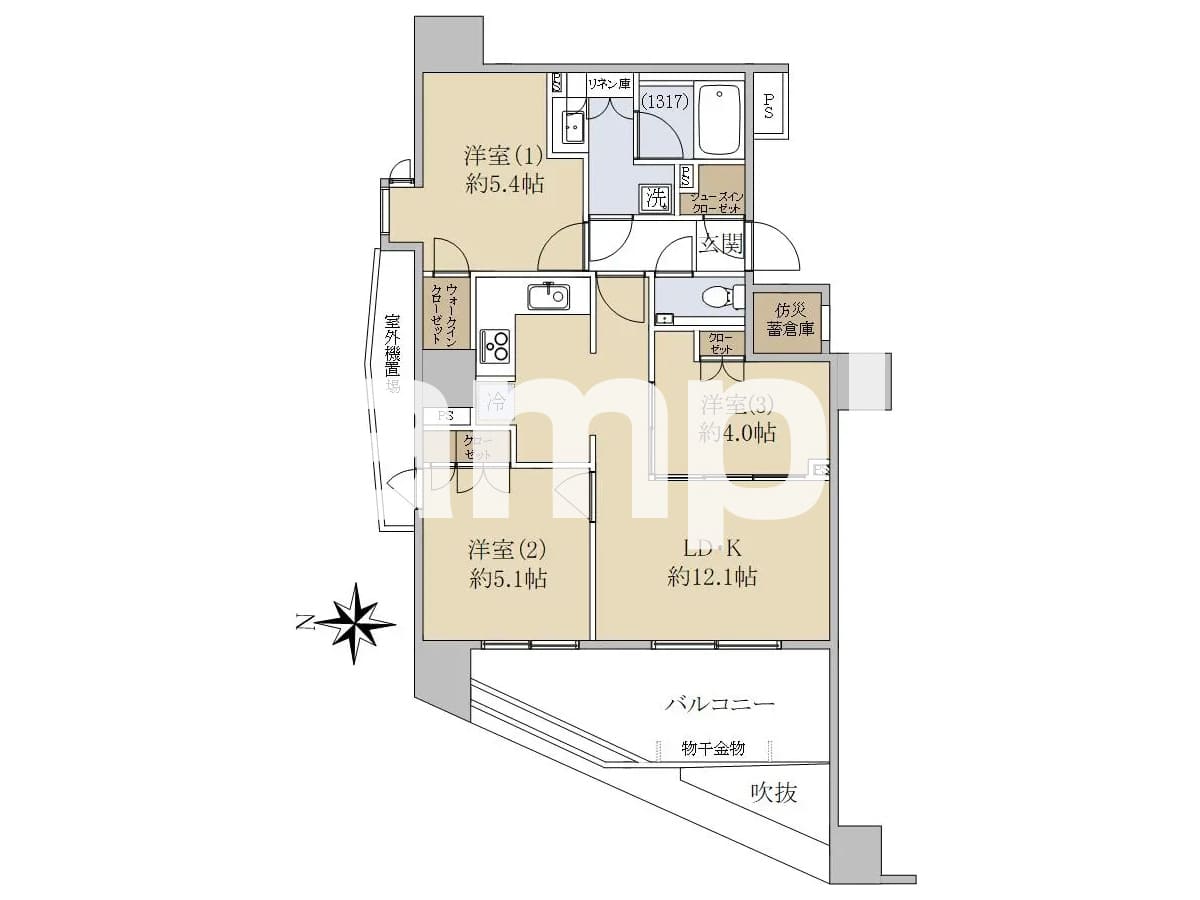 間取は3LD・Kの58.74㎡になります。全ての居室に収納がある事は勿論、洗面所にはリネン庫、玄関にはシューズインクローゼットがあり、お部屋全体の収納力が高い物件です。